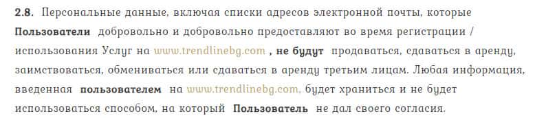 Далее в договоре утверждается, якобы форекс игроки могут не бояться за свои личные данные, но при этом нет никаких гарантий и ответственности за это у дилера Тренд Лайн Бг.