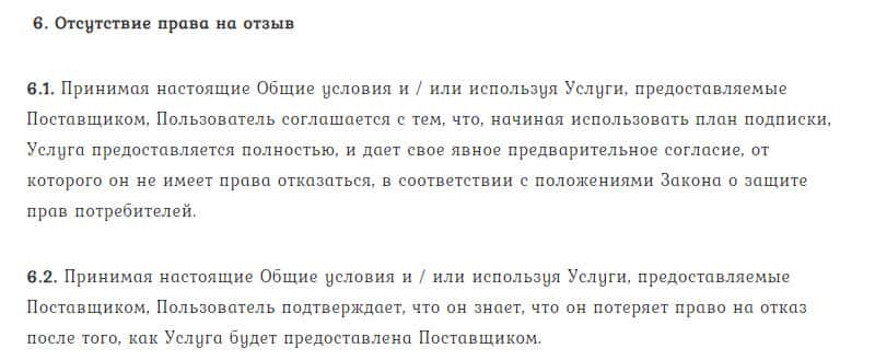 Раздел 6 "Отсутствие права на отзыв" упоминает, что клиент якобы подтверждает согласие на потерю вполне законного права на отказ от услуг фиктивного брокера Тренд Лайн Бг.
