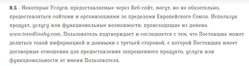 Форекс кухня TrendLineBg внаглую прописала в договоре пункт, что они имеют право передавать данные клиентов непонятным левым сторонам за пределам ЕС. Разводняк.