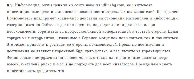Следующий пункт в договоре ворюг TrendLineBg посвящен тому, что игрок должен все операции проводить на свой страх и риск, а брокер ответственности не несет никакой.