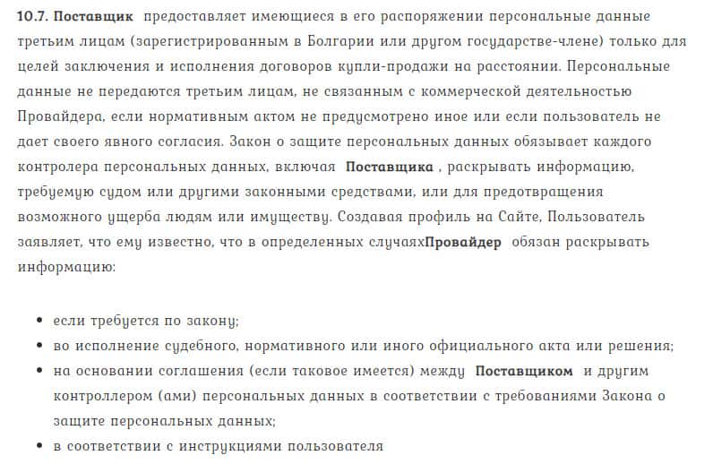 Пункт 10.7. служит звоночком для любого клиента, кто хочет рискнуть не только деньгами, но и личными сведениями при заключении соглашения с нечестной конторой Тренд Лайн Бг.
