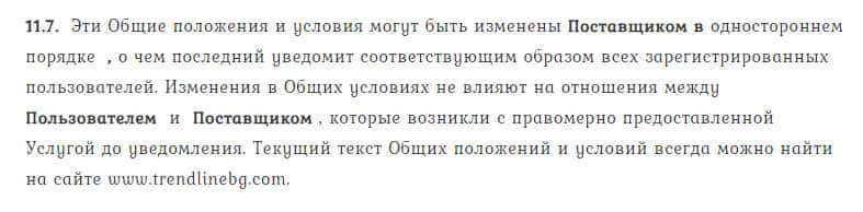 Согласно пункту 10.10. TrendLineBg вправе изменить положения договора, не согласовав это с форекс трейдером, не учитывая его интересы и как это отразится на нем собственно.
