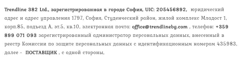На следующем изображении можно увидеть также адрес мошенников Тренд Лайн Бг в Болгарии и их электронную почту, но нет никаких гарантий. Адрес и электронка злодеев: