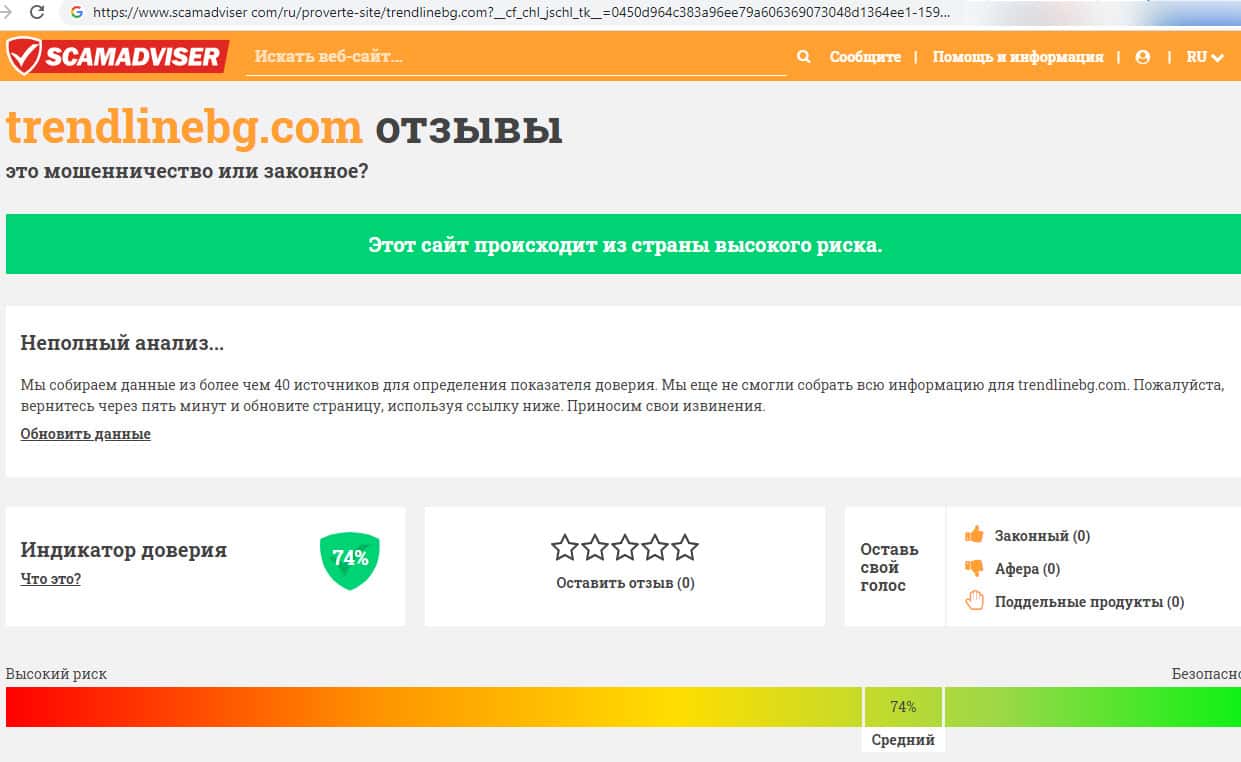 Поддельный брокер Тренд Лайн Бг по мнению уважаемого интернет-сервиса scamadviser com имеет средний рейтинг 74 %, также ресурс происходит из страны высокого риска.