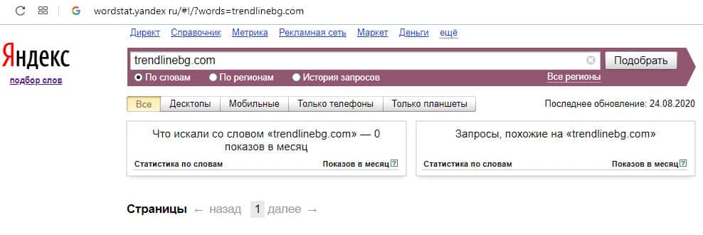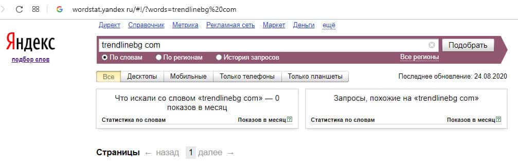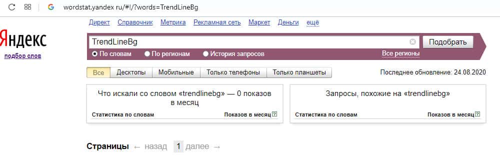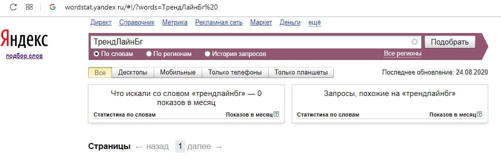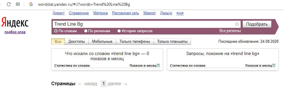 Англоязычный вариант доменного имени "TrendLineBg", вбиваемого без пробелов в поисковой системе Яндекс.Вордстат, также набрал ноль значений по запросам за месяц.