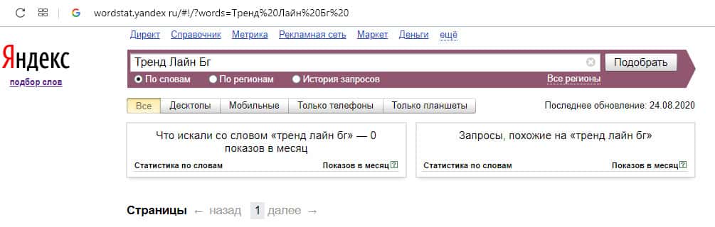 Поиск бренда "Тренд Лайн Бг" также не увенчался значительным успехом, поскольку поисковая система Яндекс продемонстрировала ноль запросов за месяц.