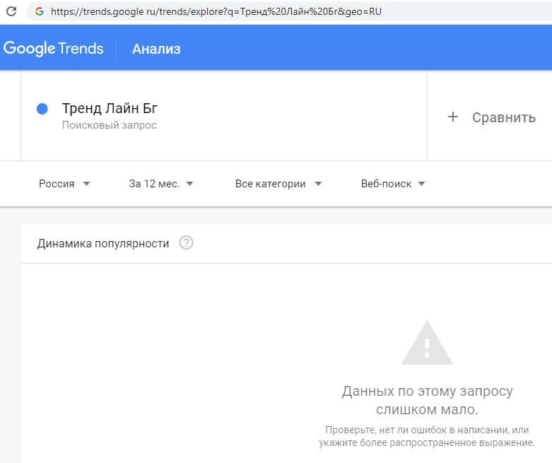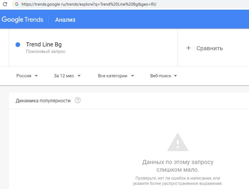 Если мы попробуем вбить в поисковик Гугл название доменного имени "TrendLineBg" на английском языке без пробелов, то получим следующий результат: очень мало запросов.