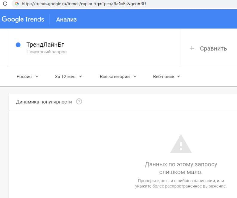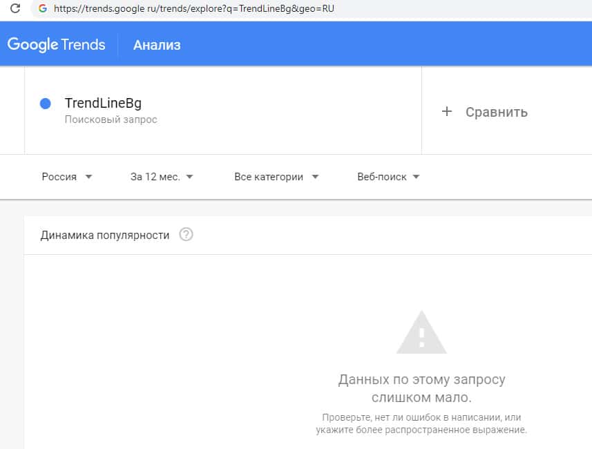 Количество запросов от интернет-пользователей брендового имени "trendlinebg com" без точки в поисковой системе Гугл Трендс также было очень небольшим.