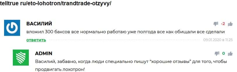 - TrandTrade специально нанимают ботов, чтобы те писали о них положительные отзывы