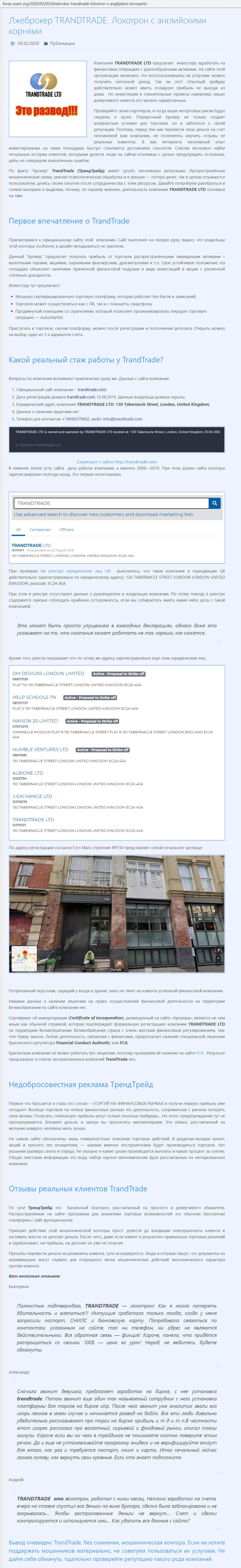 Достаточно подробный обзор мошеннической компании Тренд Трейд был сделан авторами сайта forex-scam org, где этого брокера называются лохотроном с английскими корнями. Этот информационный материал даст понять каждому, что ни в коем случае нельзя иметь дела с ТрандТрейд и аналогичными организациями, потому как созданы эти интернет-проекты жуликами, цель которых обворовать как можно больше доверчивых граждан.