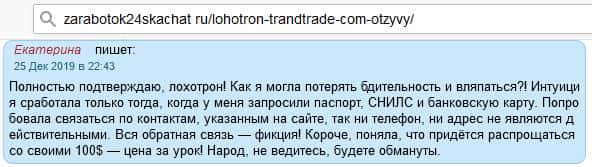 На некоторых добросовестных ресурсах рунета прямо говорят, что TrandTrade - это очередной лохотрон, с которым просто не нужно связываться. Причем говорится об этом прямо. Если с ними не повезет сотрудничать, то с вас выманят все деньги и в итоге просто кинут, поэтому сотрудничество с такого рода конторами очень опасно.