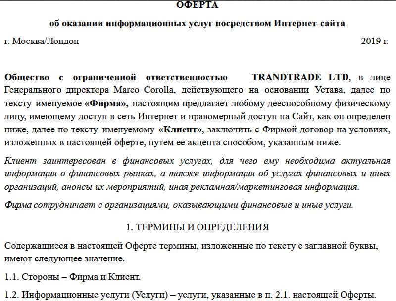 Описание клиентского соглашения конторы TrandTrade