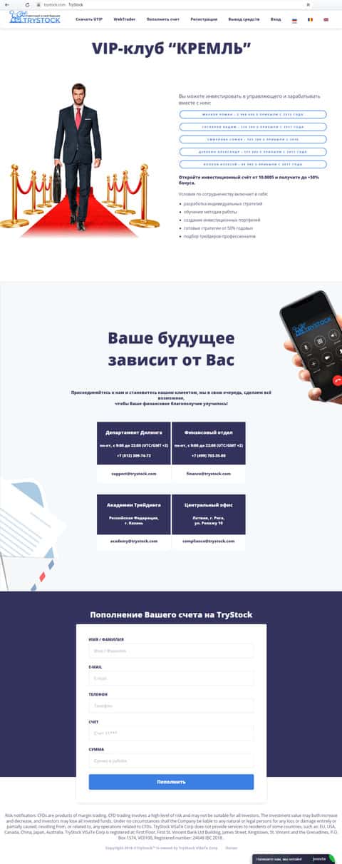 TryStock – очередной сетевой мошенник, использующий как приманку трейдинг на Форекс и CFD. Данные мошенники очень постарались максимально отбелить свою репутацию, чтобы привлечь на свой веб-ресурс побольше лохов. Так, шулера Три Сток наводнили Интернет фейковыми отзывами, восхваляющими этих самих жуликов. Фейковые они потому, что действительности не соответствуют. Подтверждается же это реальными отзывами о наглых звонарях и невозможности вывода средств. Кроме того, вся фактическая информация, предоставленная на сайте TryStock – также липовая, и предназначена исключительно для заманивания клиентов на сервис и их дальнейшего облапошивания. Ни в коем случае не связывайтесь с аферистами Три Сток, иначе потеряете время и деньги!