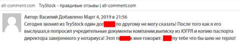 Тон звонарей TryStock меняется до неузнаваемости, когда клиент начинает отказываться вложится в их Интернет-лохотрон. Мошенники начинают переходить на оскорбления и маты, что в очередной раз выдаёт их настоящую сущность. Три Сток являются не более чем шулерами-аматорами, которые пытаются разводить людей, используя для этого популярные во все времена Форекс и CFD.