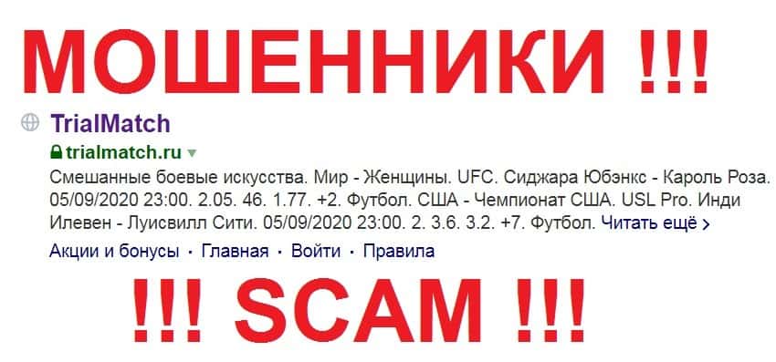 TrialMatch Ru - очередная мошенническая букмекерская контора, которая осуществляет деятельность по разводу интернет-пользователей на деньги, якобы давая возможность выиграть на ставках на спорт, вывести деньги со счета будет невозможно, поскольку контора липовая, аферисты Триал Матч работают в одной связке и находятся на одном IP-адресе с букмекерскими конторами Бет Виннер и Мастер Пари. Обходите стороной и не связывайтесь с шулерами Trial Match !!!