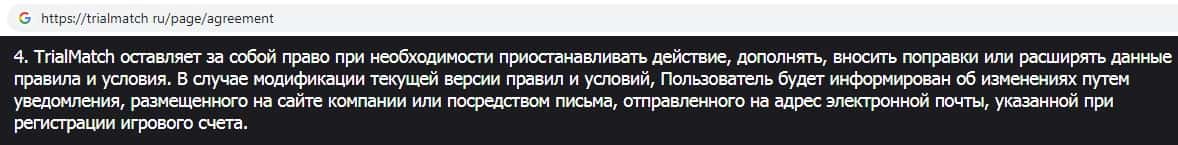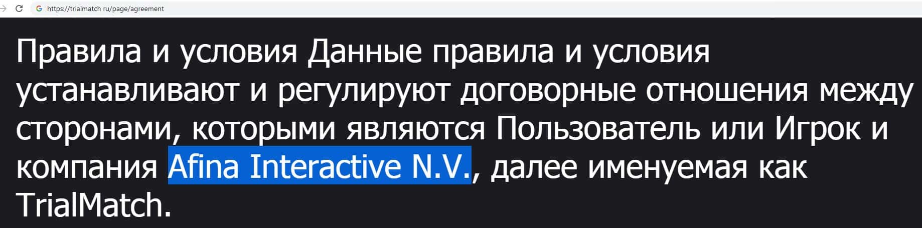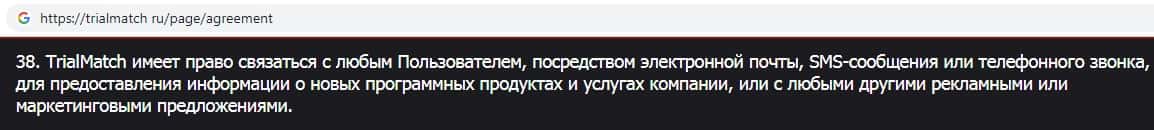 - Пользовательское соглашение на веб-сайте мошеннической организации Триал Матч