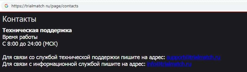 Обманщики Триал Матч на своем официальном интернет-ресурсе указывают несколько адресов электронной почты, а именно: