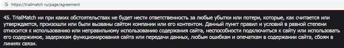 Согласно тому, что аферисты пишут в соглашении, букмекерская компания Trial Match не несет никакой ответственности за не полученную прибыль клиентом, а так же за возможные убытки.