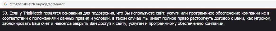 Шулера Trial Match в любой удобный им момент могут заблокировать счет клиента, также закрыть доступ к их сайту и предоставляемым услугам навсегда.