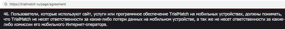 Мошенники Триал Матч не несут никакой ответственности за пользование клиента их сайтом на мобильном устройстве.