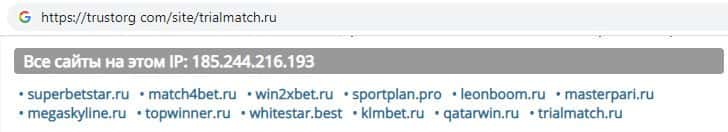 Так же обнаружен тот факт, что контора Триал Матч находится на одном IP с подобными интернет-лохотронами, а именно Бет Виннер и Мастер Пари, которые схожи по своему содержанию.