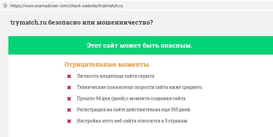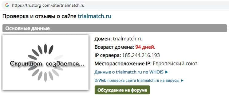Проверка онлайн-сервиса жуликов Триал Матч на trustorg com показала, что возраст домена к моменту написания статьи составляет 94 дня.