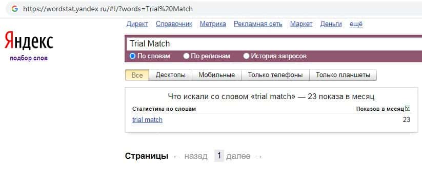 Количество запросов по бренду названия компании на английском языке с пробелом "Trial Match" на Яндекс Вордстарт составляет 23 запроса за месяц.