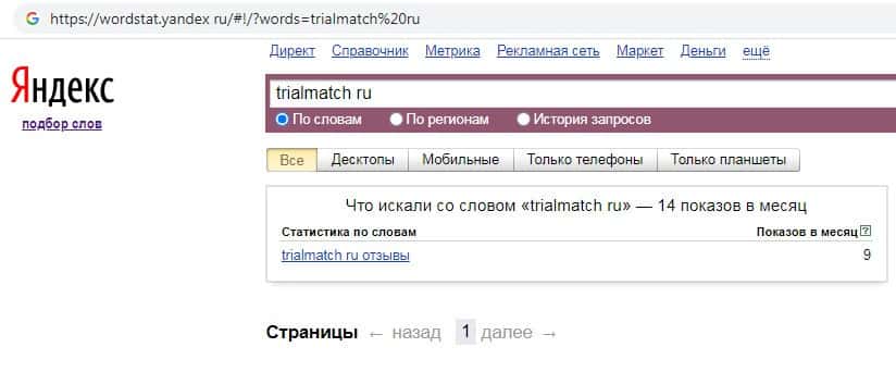 Количество брендовых запросов названия домена без точки "trialmatch ru" на Вордстарт Яндекс Ру составляет также 14 показов за месяц.