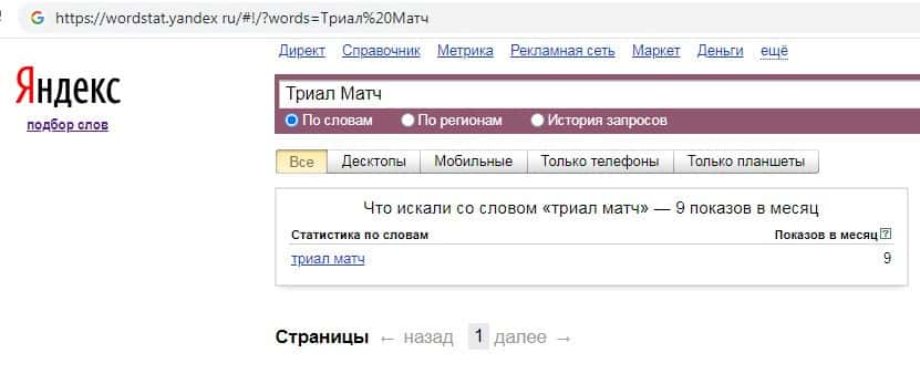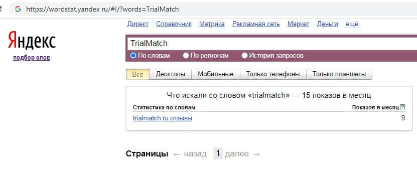 По запросам по бренду названия компании на русском языке с пробелом "Триал Матч" на Яндекс Вордстарт показатель 9 запросов за месяц.