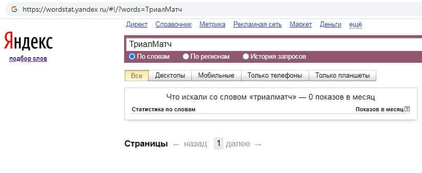 На wordstat yandex ru отсутствует информация о запросах по бренду названия компании на русском языке без пробела "ТриалМатч".