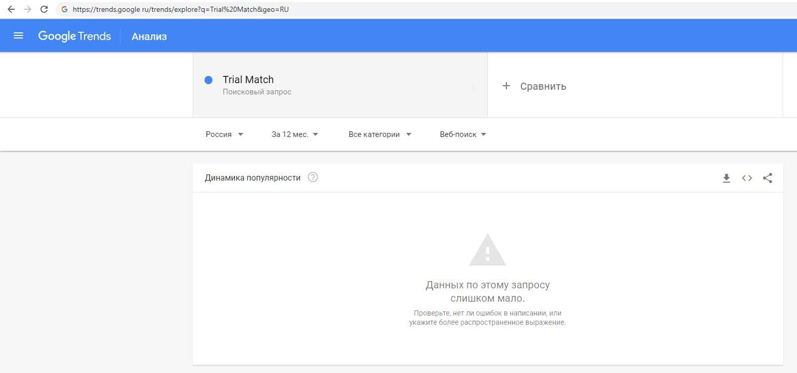 По количеству запросов по бренду названия домена без точки "trialmatch ru" на trends google ru нет никаких данных.