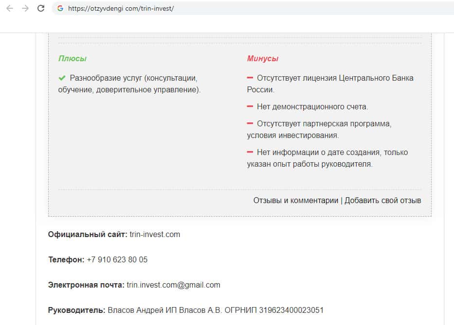 Сайт otzyvdengi com сделал обзор на компанию разводил Трин Инвест, после чего представил все плюсы и минусы фирмы. Из плюсов почти ничего нет, кроме разнообразия услуг, но вот из минусов сайт подчеркнул: отсутствие лицензии, отсутствие демонстрационного счёта, отсутствие партнёрской программы, а так же нет информации о дате создание компании, только информация о опыте сотрудников.