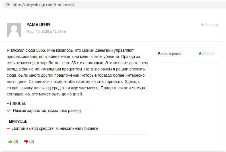 В данном отзыве о компании разводил Трин Инвест пользователь сообщает, что инвестировал 500 долларов, и за долгое время компания заработала всего 3 доллара, после чего пользователь решил, что лучше сам будет заниматься торговлей, и сделал запрос на вывод средств, но компания не вернула деньги, и уже месяц клиенту фирма не возвращает средства.