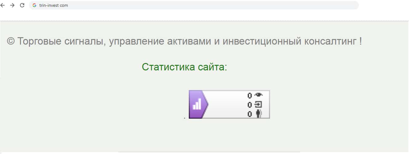 Далее сайт просто представляет информацию о своей компании и о услугах, которые они предоставляют. Вся информация просто напечатана на главной странице. Фирма пишет о кризисах, падениях рынков, и о том, как вопреки всему компания кидал Trin-Invest справляется с этим и зарабатывает деньги своим клиентам. Очень жаль, что самые наивные пользователи ведутся на это.Завершает сайт компании кидал Trin-Invest раздел со статистикой сайта. Та пользователи могут посмотреть сколько людей просматривают этот сайт, сколько заходят на него. Но вот только увидеть там можно только одну цифру - 0. Никто не заходит на сайт и не посещает страницу жуликов. Компания представила статистику, которая сама и хоронит этих мошенников.