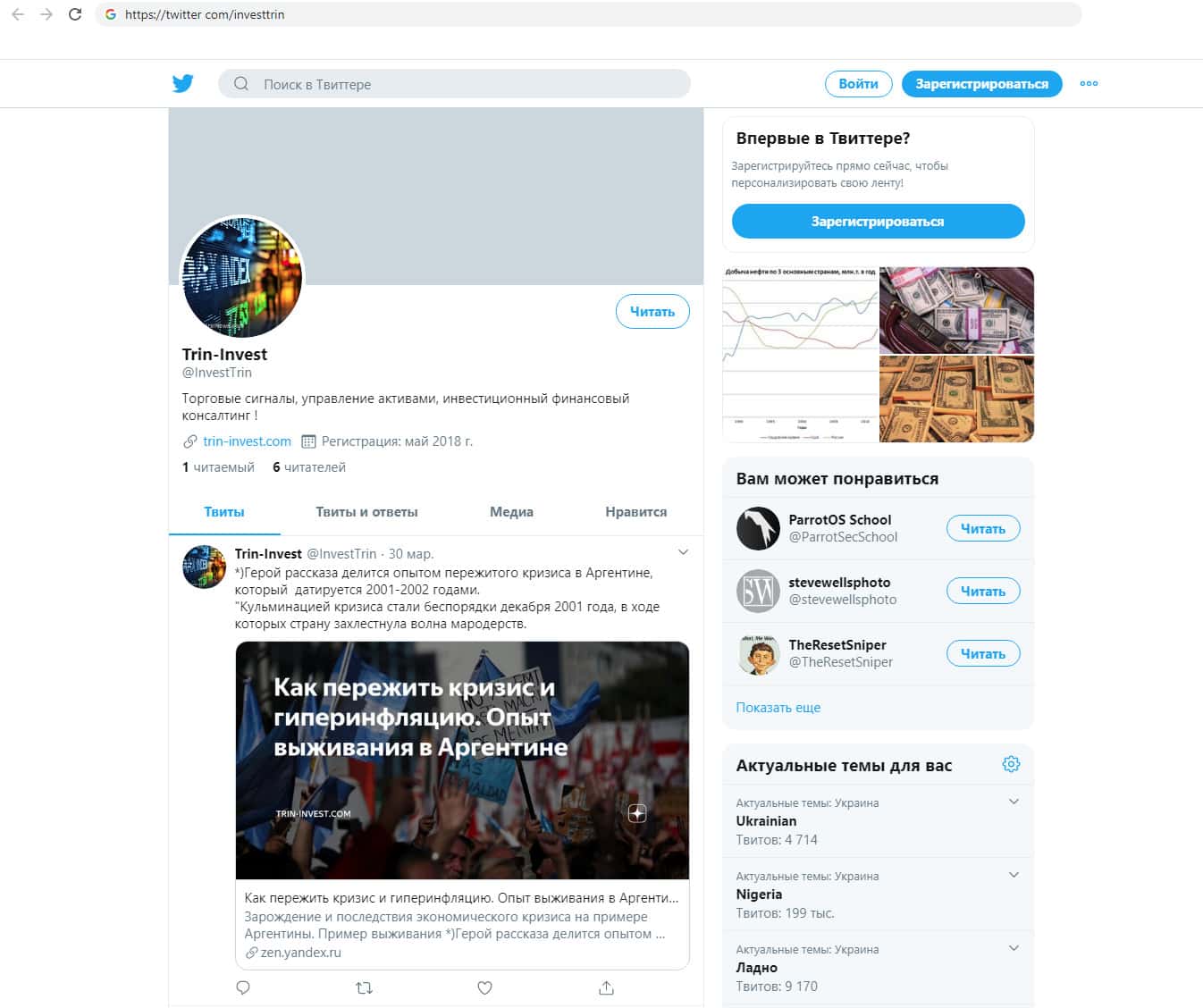А вот в твитере у аферистов Trin-Invest дела идут не очень. Там на них подписалось всего 6 человек, которые скорее всего являются администраторами страницы. Видимо не смогли они заинтересовать ту аудиторию, или же наоборот, заинтересовали, и информация о их мошенничестве всплыла, и от этой страницы отписались все пользователи.