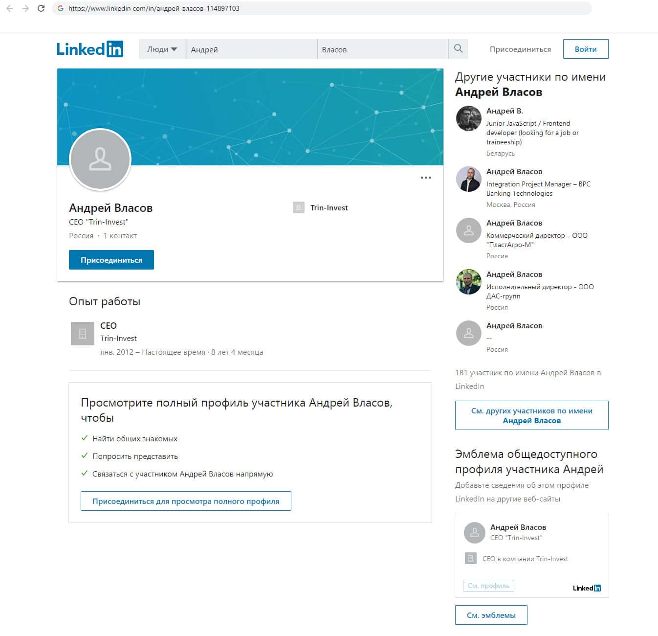 Лохотрон Трин Инвест так же зарегистрировал аккаунт в социальной сети для поиска и установления деловых контактов linkedin com. Но вот только информации там никакой нет, только лишь куча страниц с именем главного финансового консультанта компании "Андрей Власов", но только все аккаунты с этим именем имеют разное фото, что говорит о том, что компания выдаёт разных людей за одного консультанта.