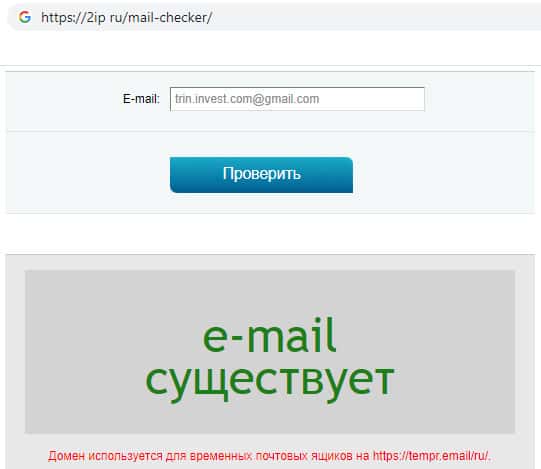 Мы проверили адрес электронной почты, который компания разводил Трин Инвест указала в качестве контактного. Оказалось, что такая почта существует, но только на сайте указало, что такой домен используется для временных почтовых ящиков, то есть данная почта может прекратить своё существование в любой момент.