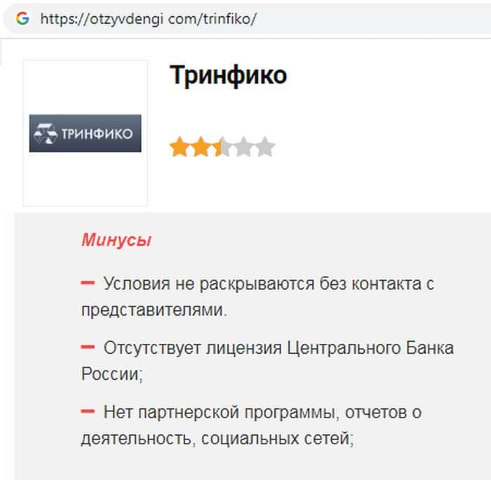 - Компанию Тринфико пользователи называют лохотроном без лицензии