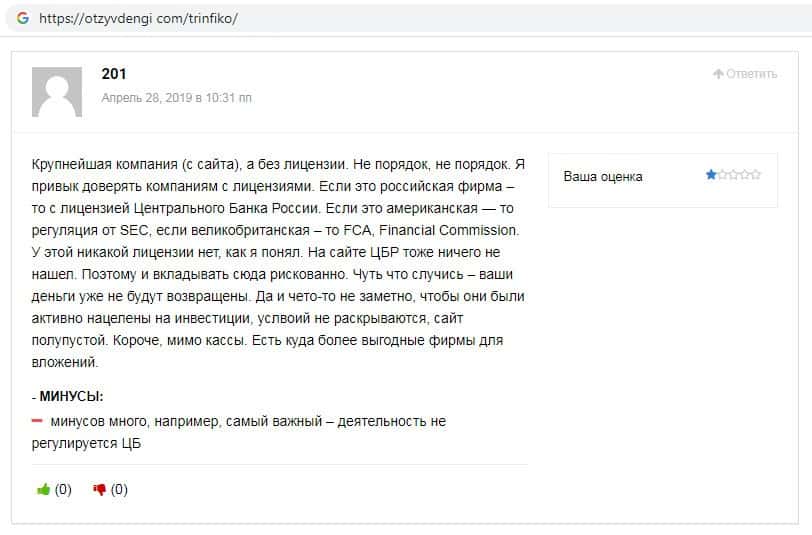 Компанию Тринфико пользователи называют лохотроном без лицензии