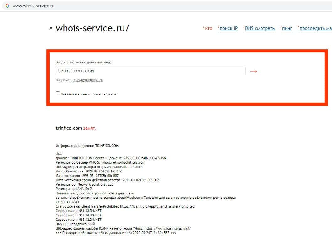 Проверка срока действия домена скам-организации Trinfico