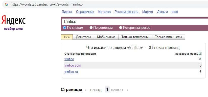 Количество запросов по бренду названия компании на английском языке "Trinfico" на Яндекс Вордстарт составляет 31 запрос за месяц.