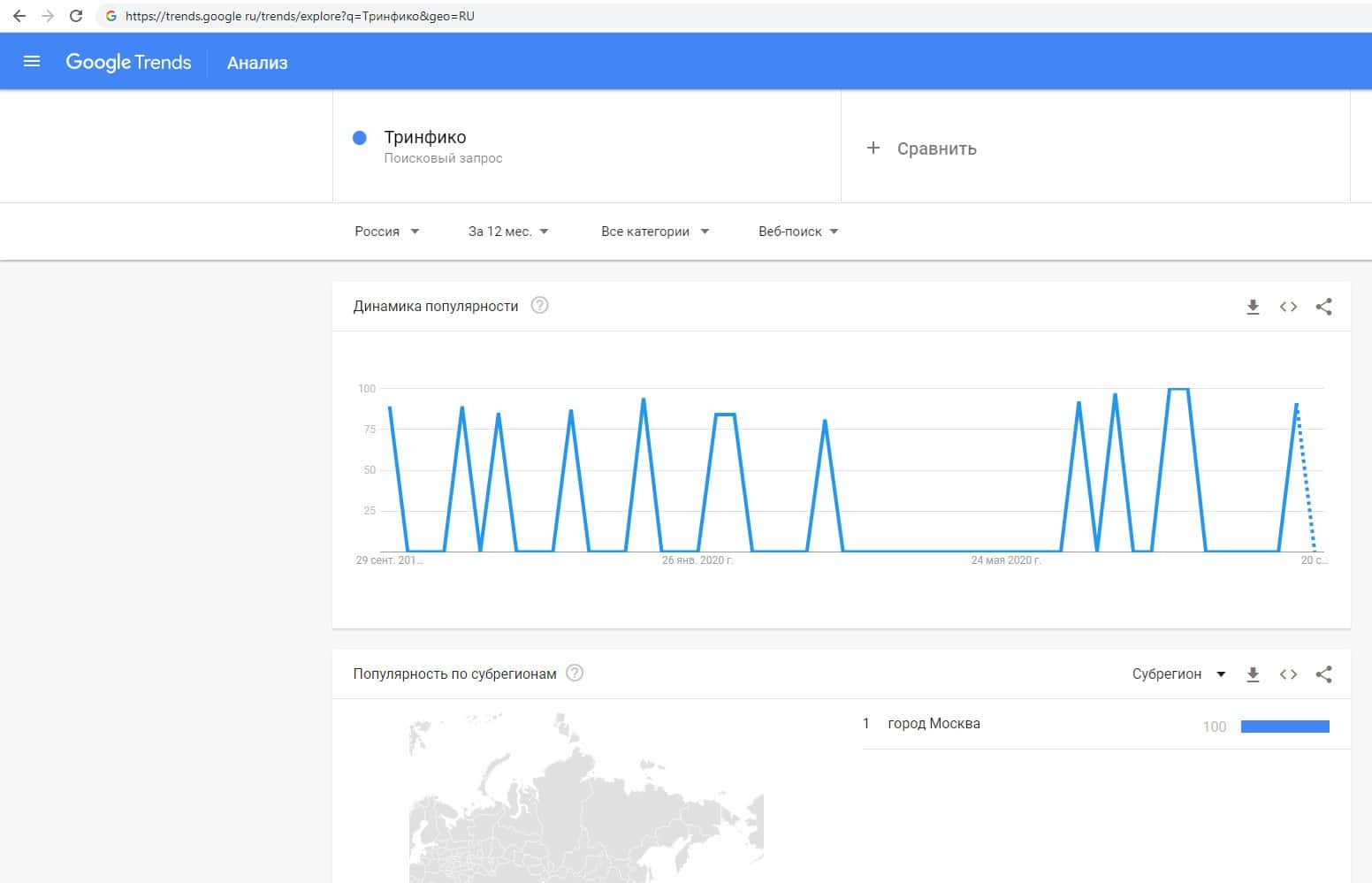 По количеству брендовых запросов названия компании на русском языке "Тринфико" на Трендс Гугл Ру отслеживается некая динамика популярности.