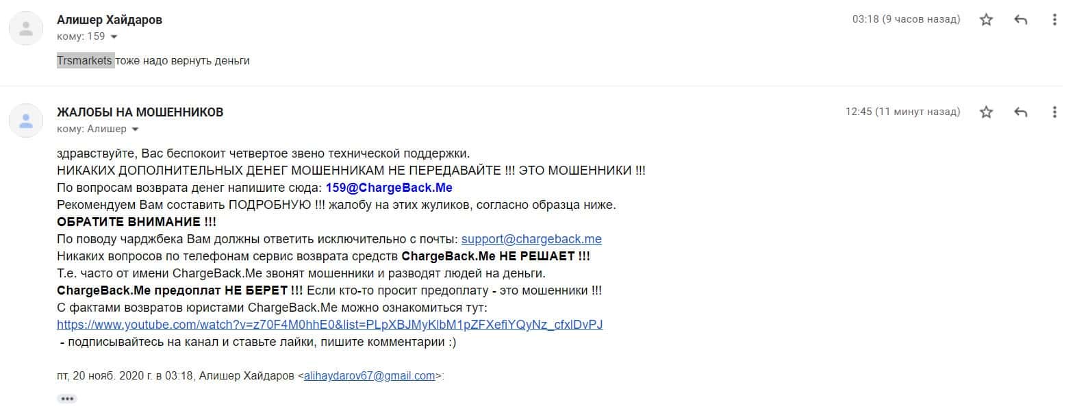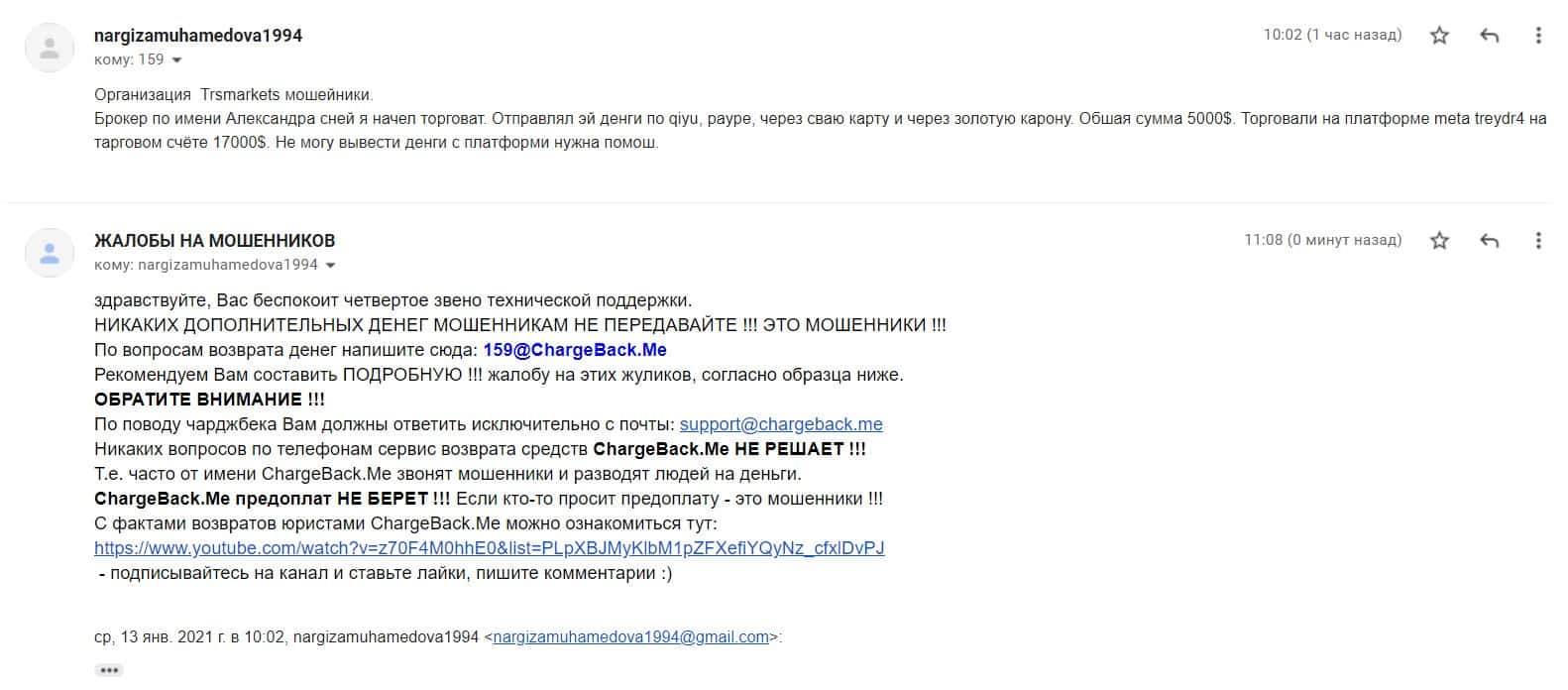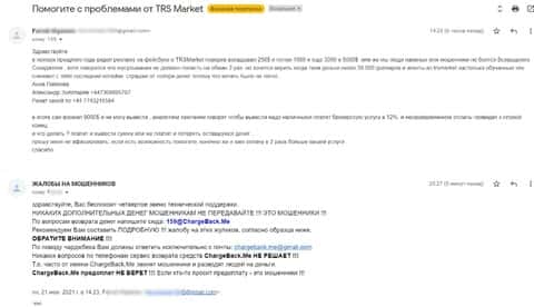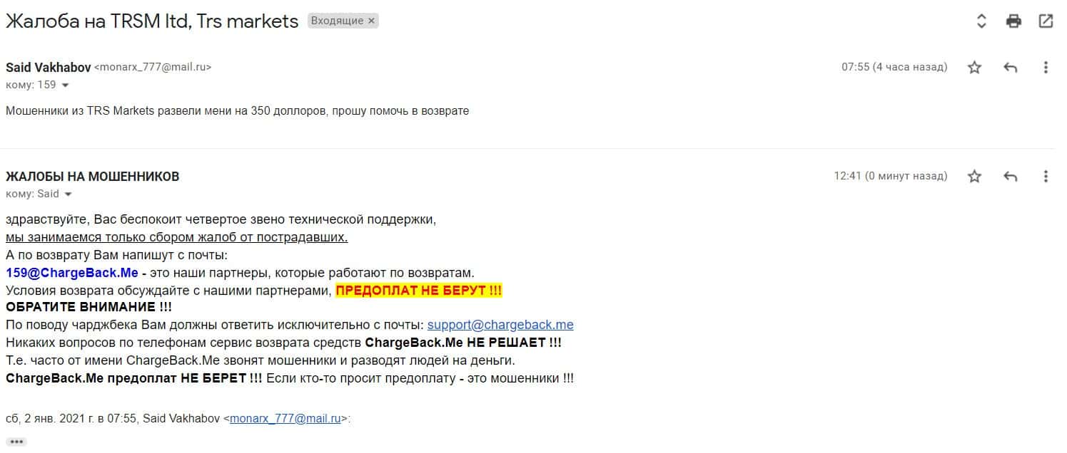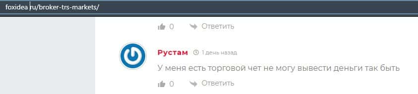 В данном разделе предлагаем увидеть информационный материал в виде жалобы от одного из пострадавших шараги TRSMarkets о том, что шулера обманули его на деньги.