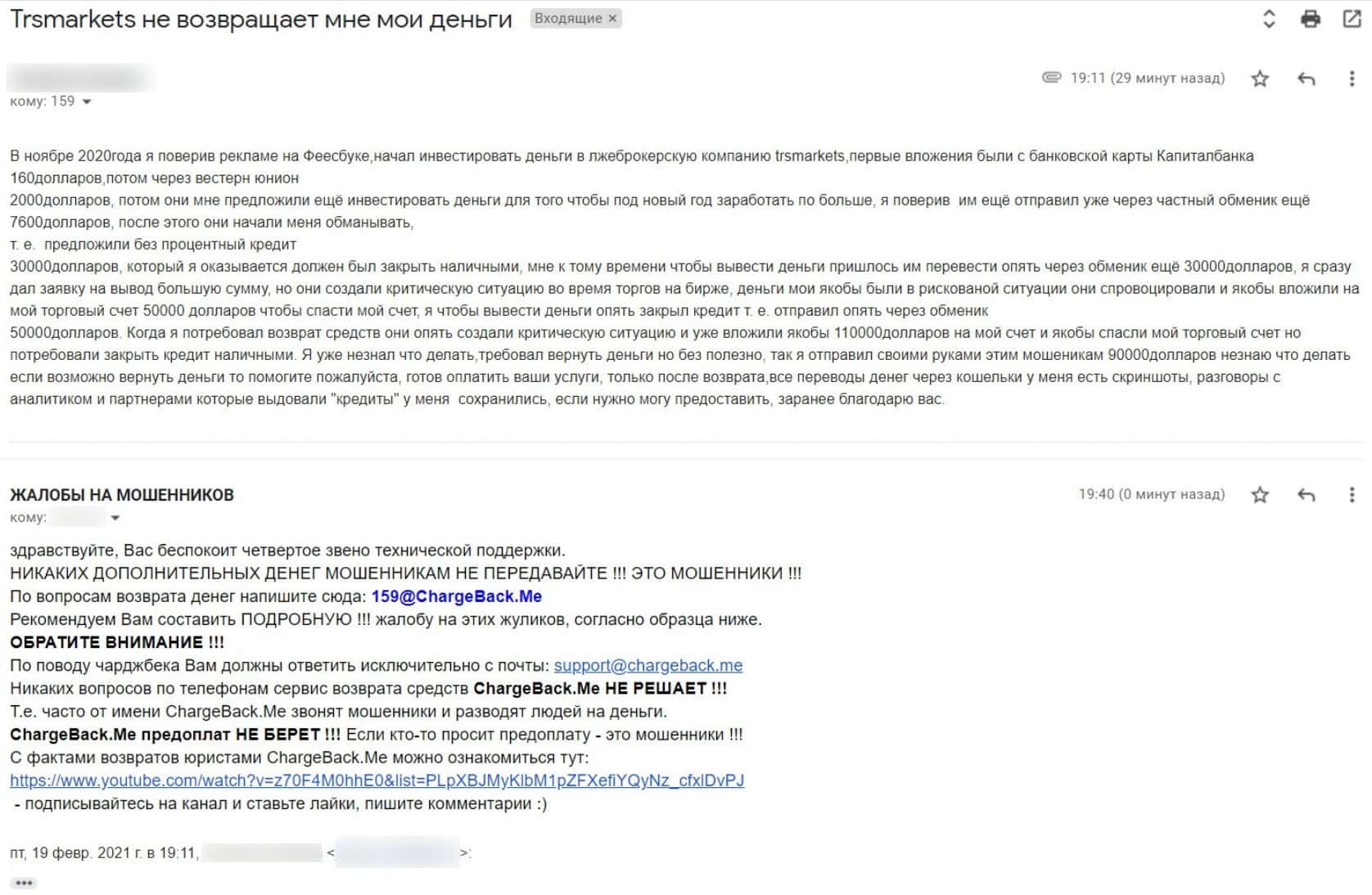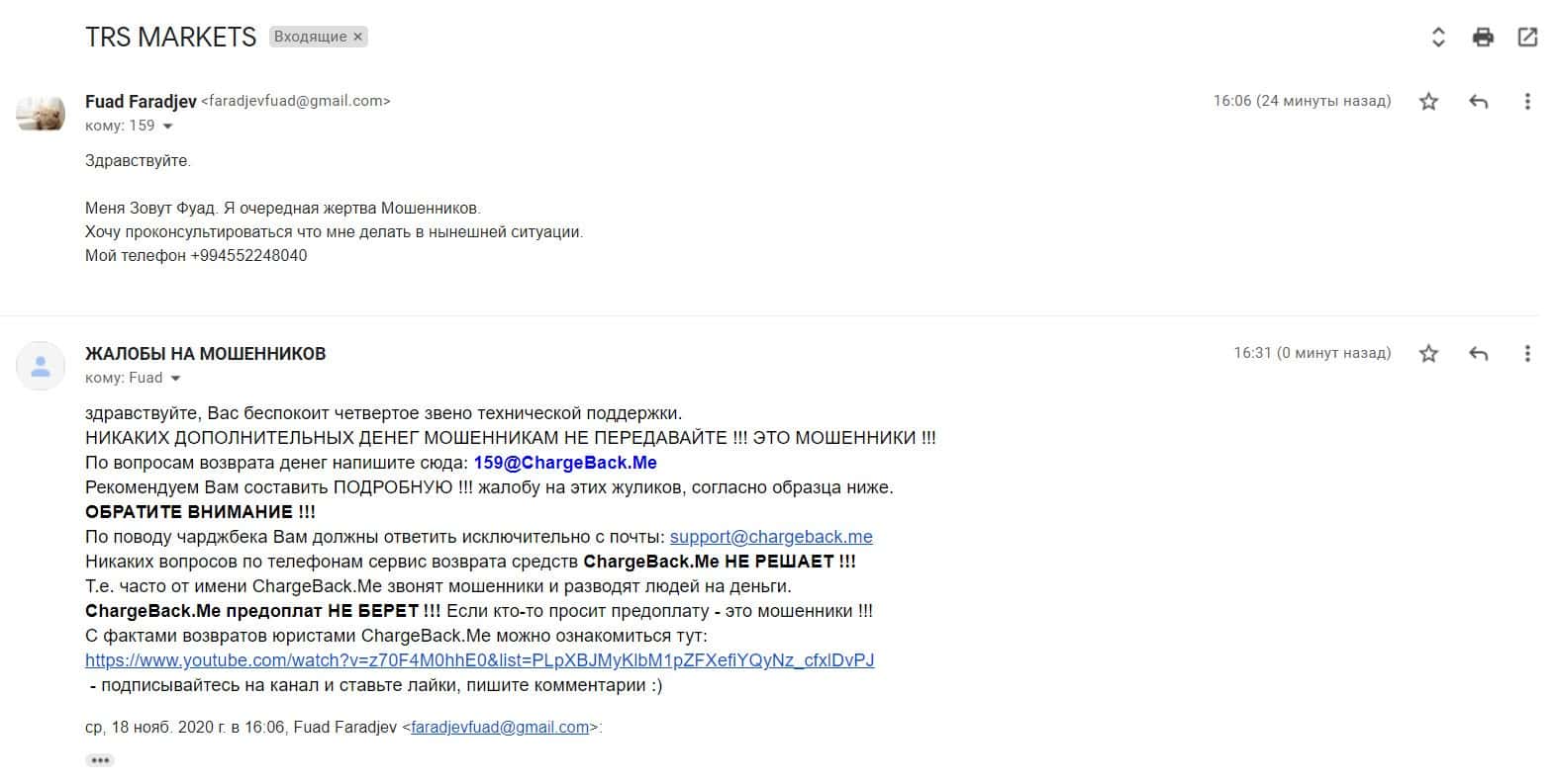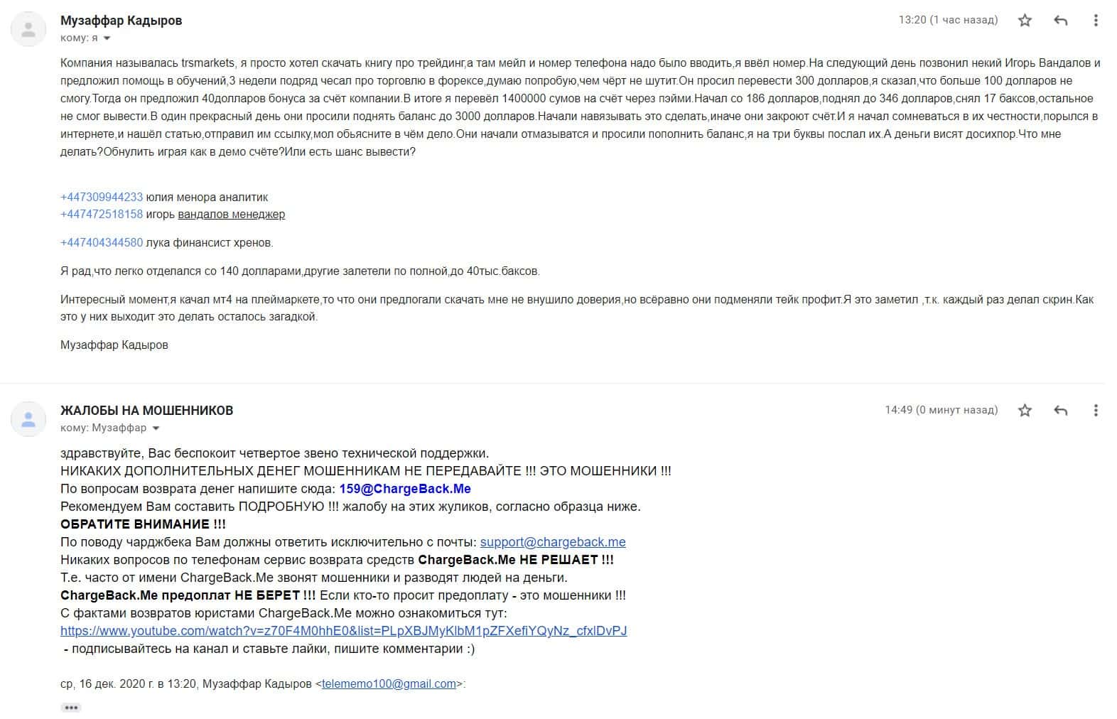 В данном разделе предлагаем увидеть информационный материал в виде жалобы от одного из пострадавших шараги TRSMarkets о том, что шулера обманули его на деньги.