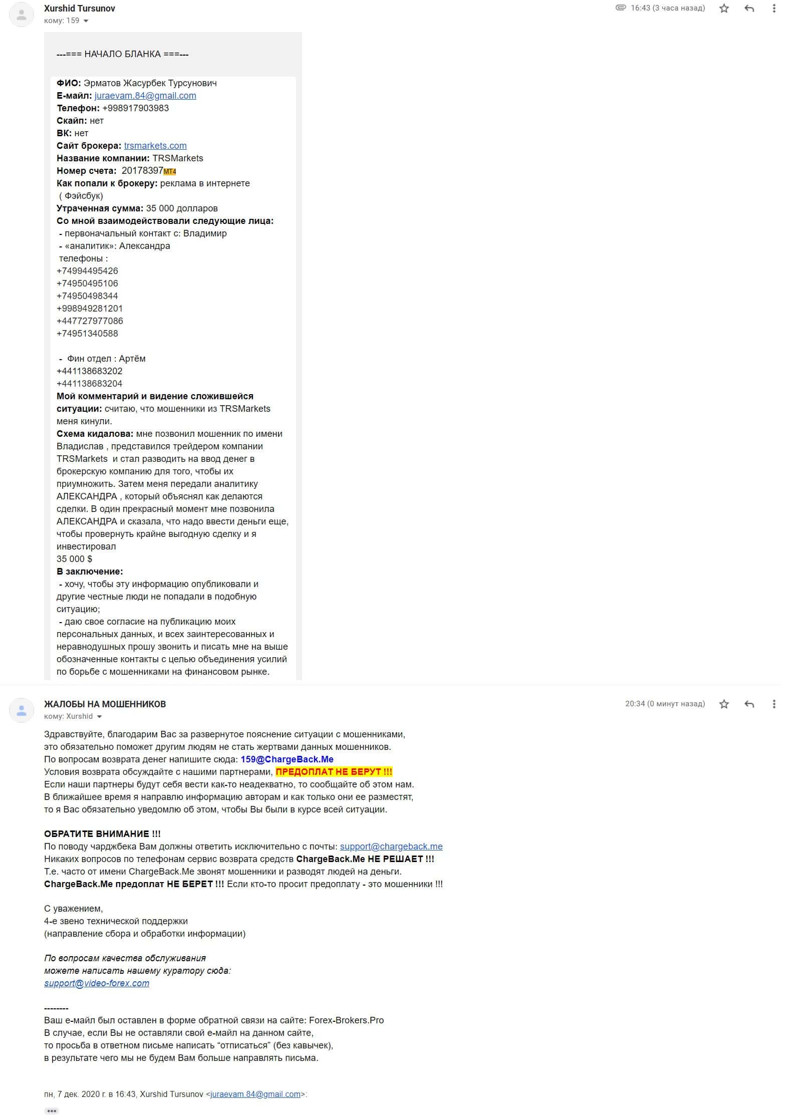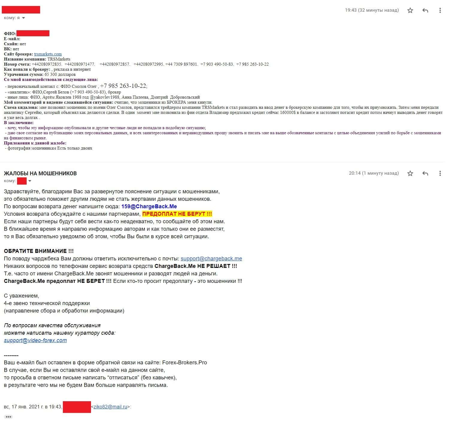 - Информация от очередного обманутого клиента TRSMarkets