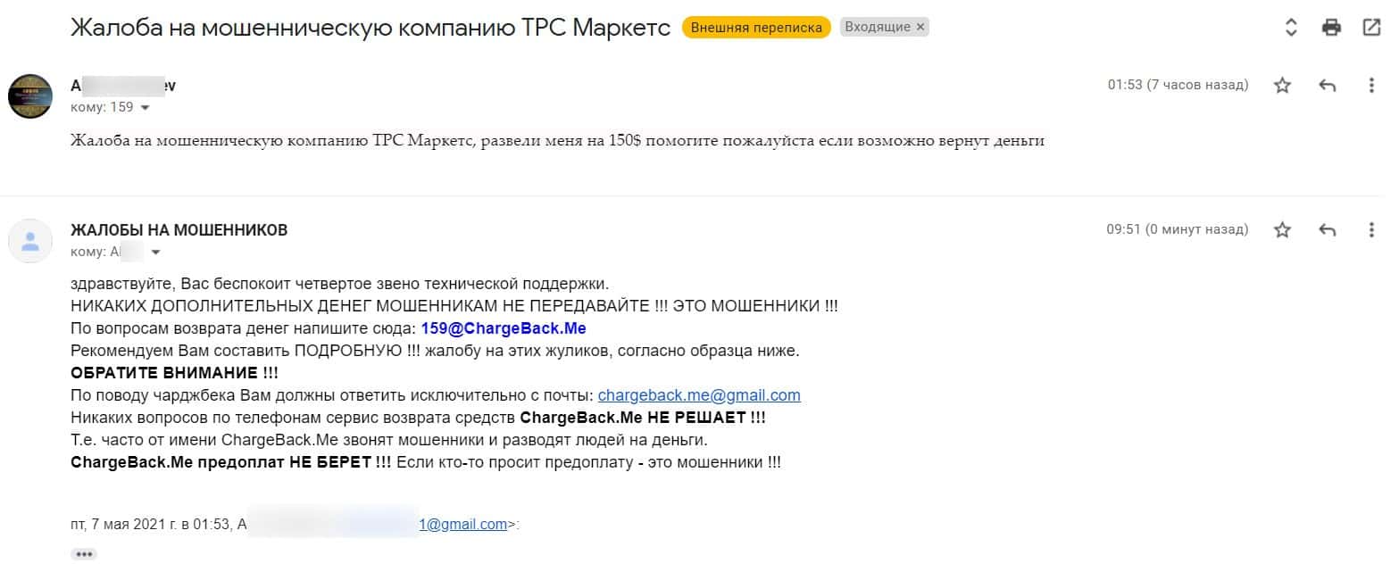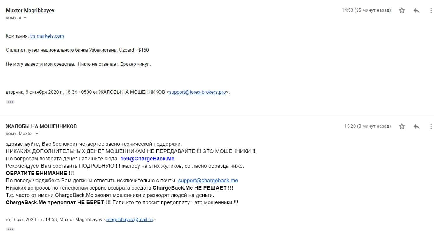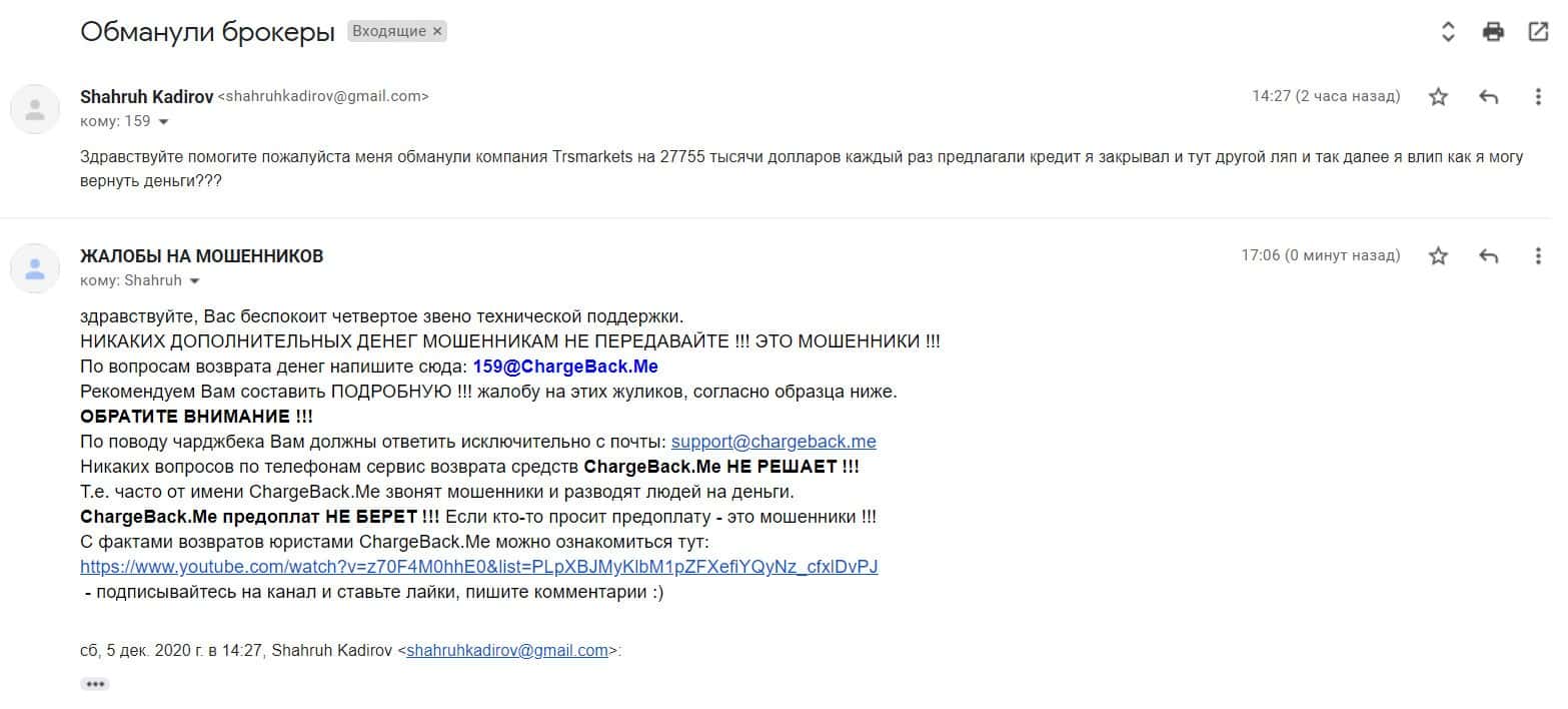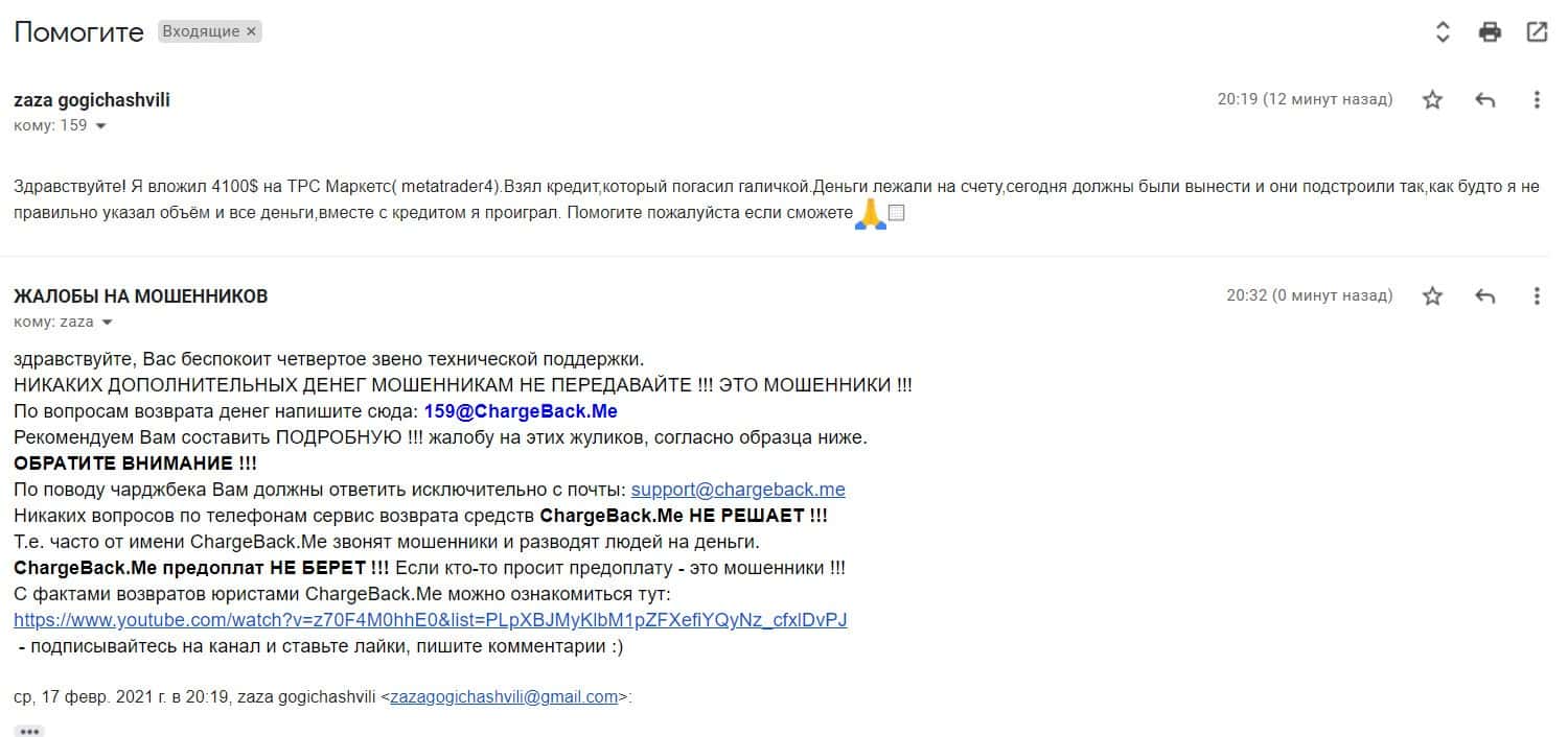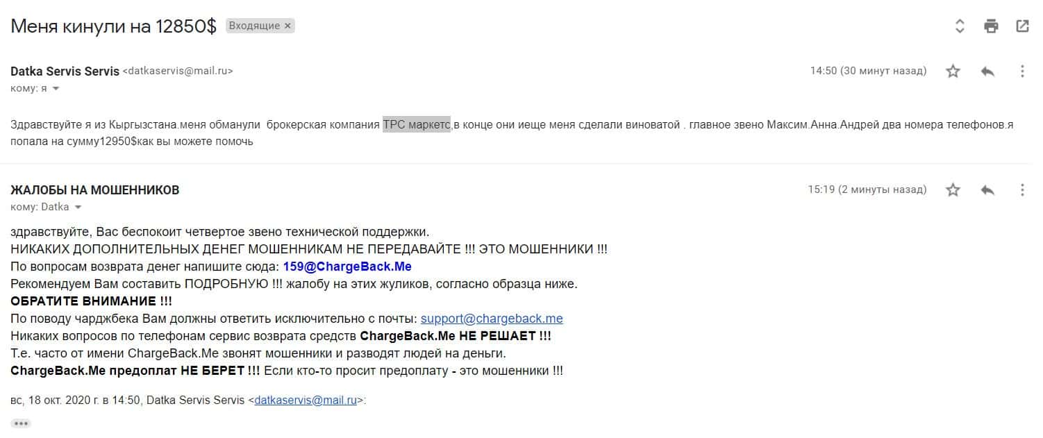В разделе представлен скриншот письма с жалобой обманутого онлайн-пользователя, который сообщил название конторы, где его кинули, это был псевдоброкер ТРС Маркетс.