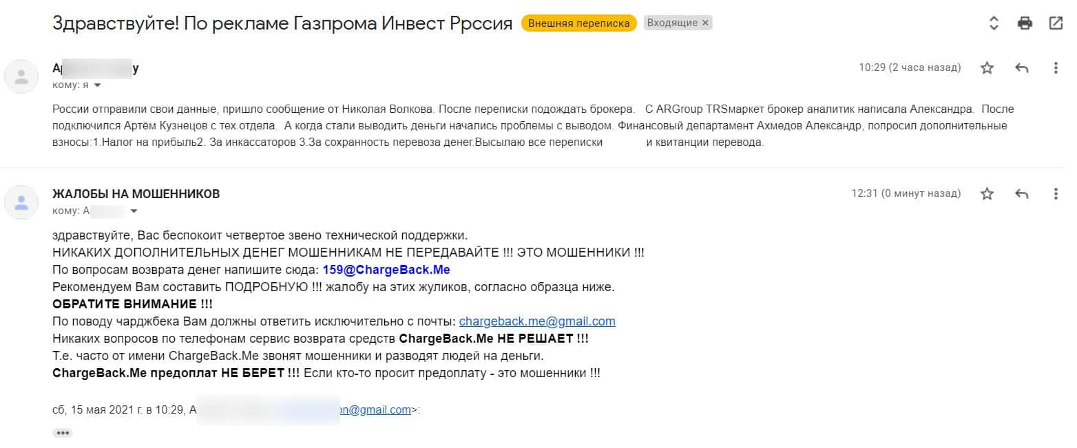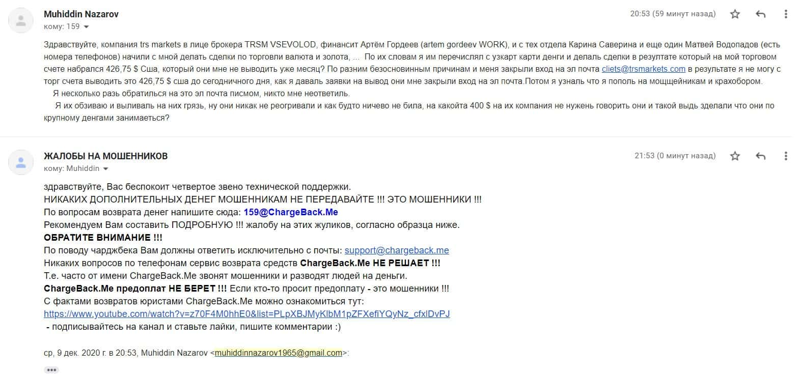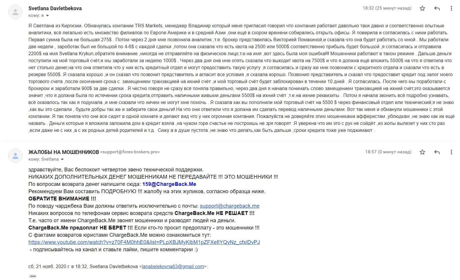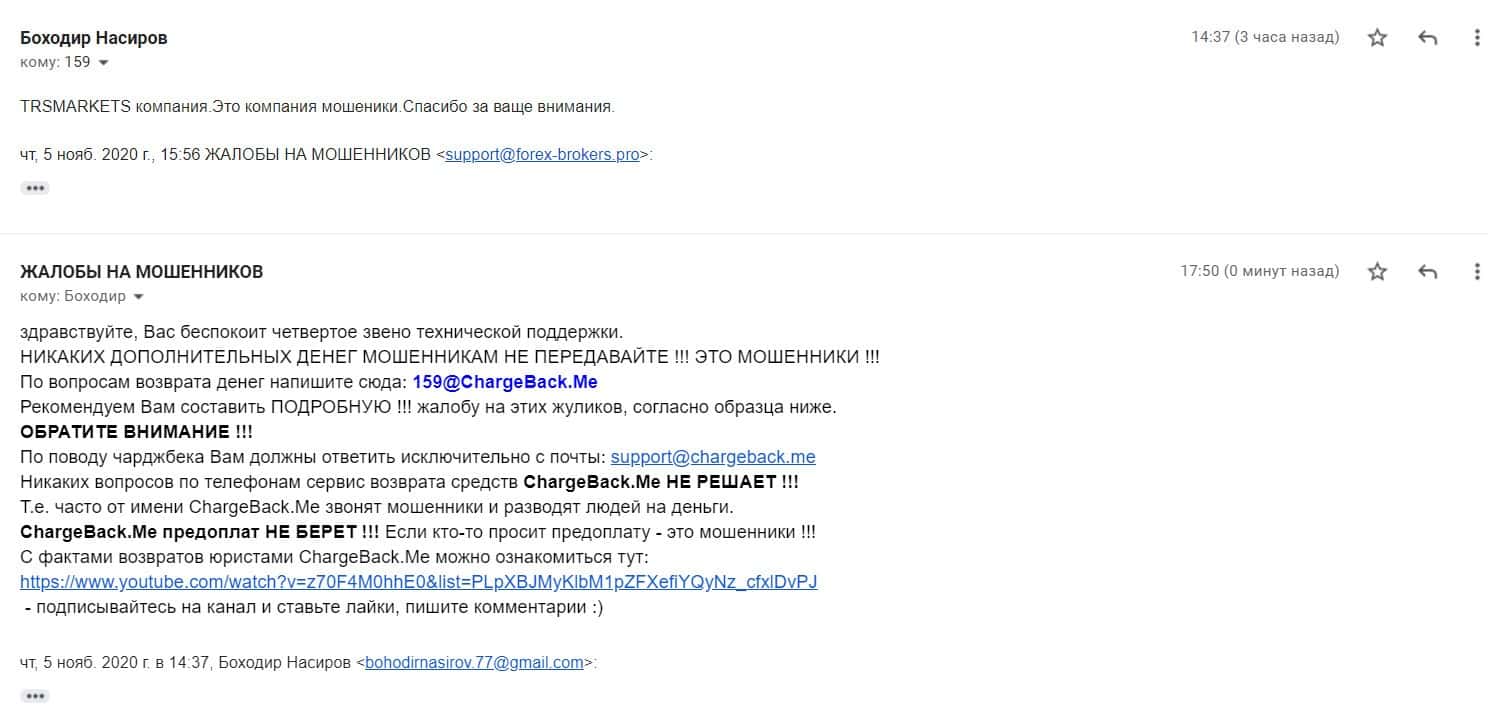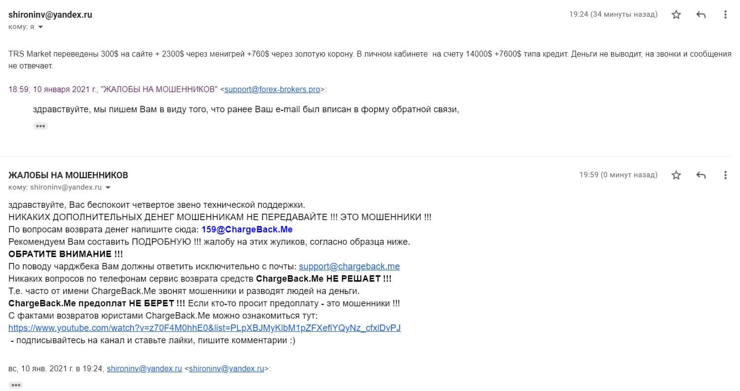 В разделе представлен скриншот письма с жалобой обманутого онлайн-пользователя, который сообщил название конторы, где его кинули, это был псевдоброкер ТРС Маркетс.