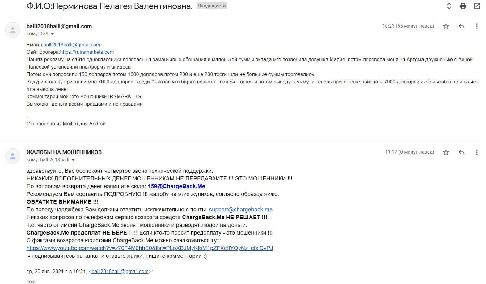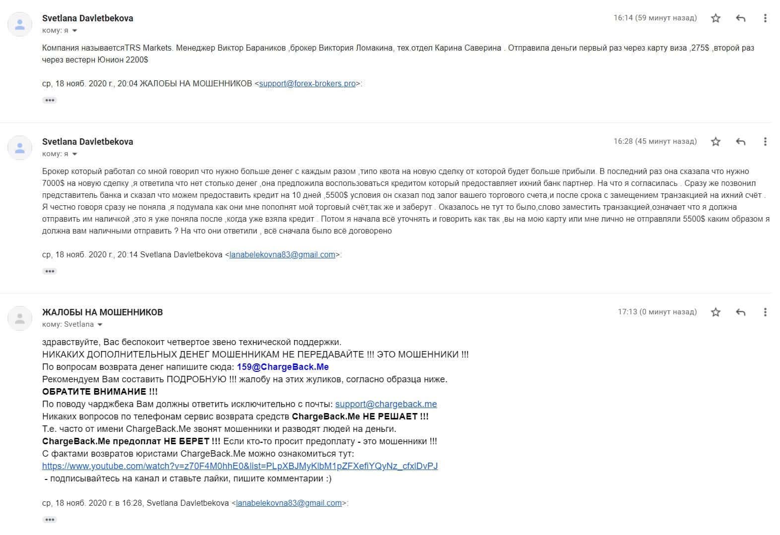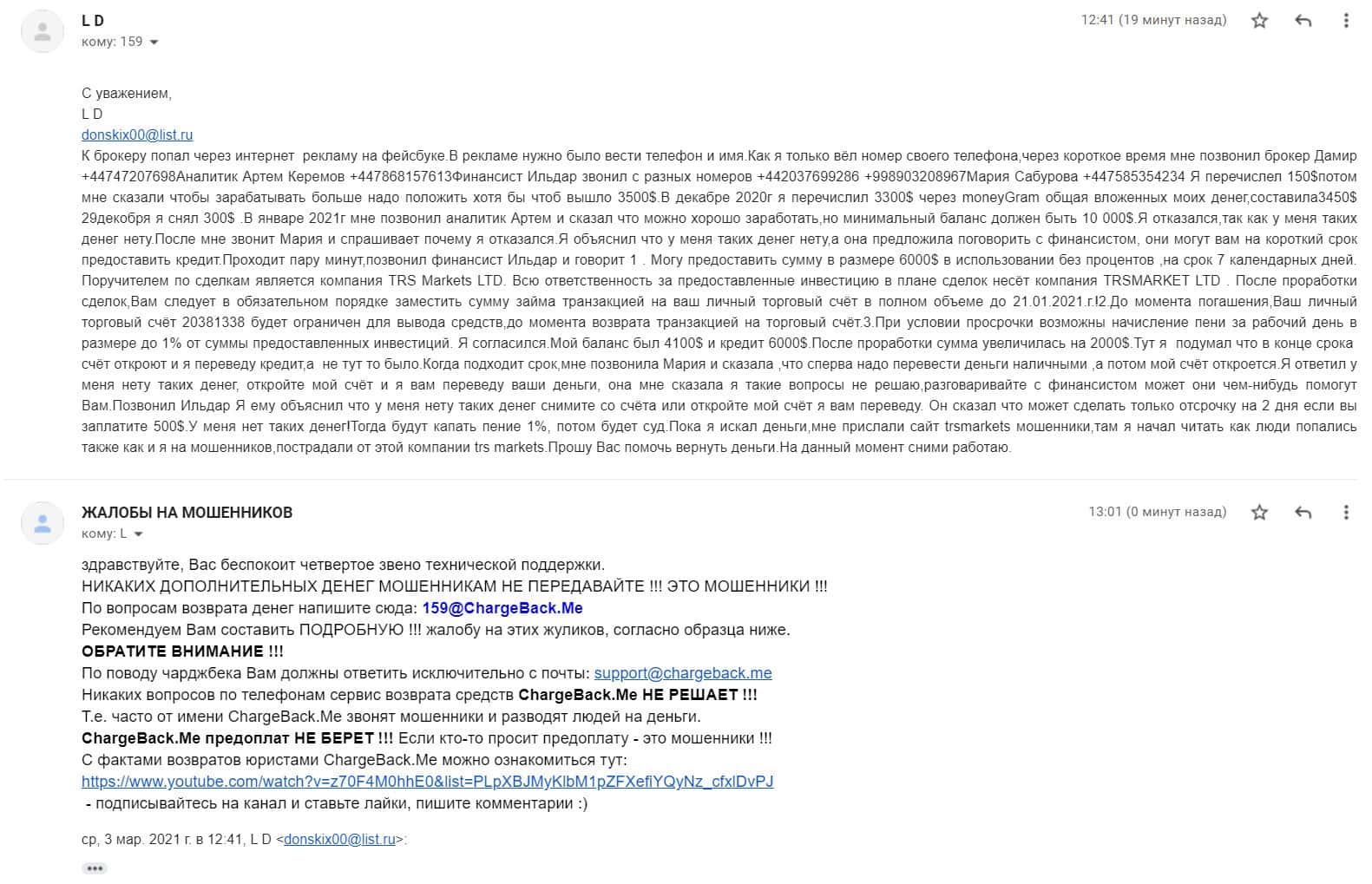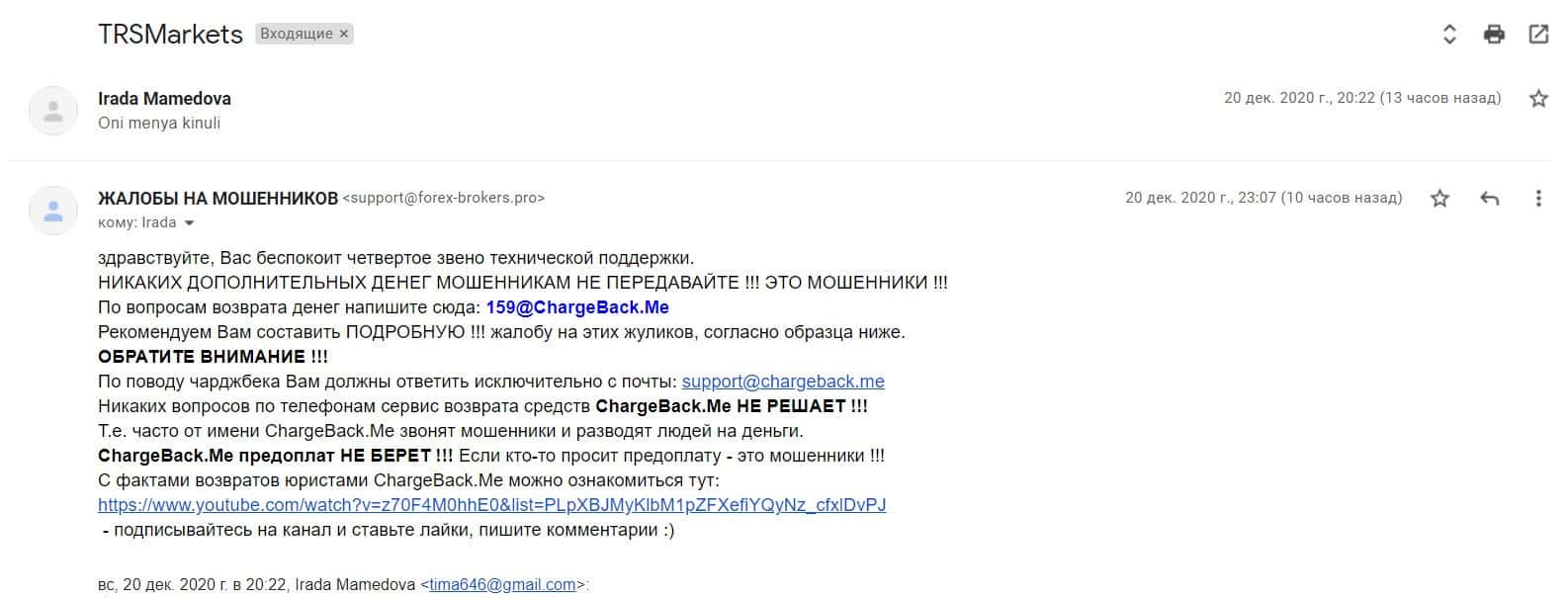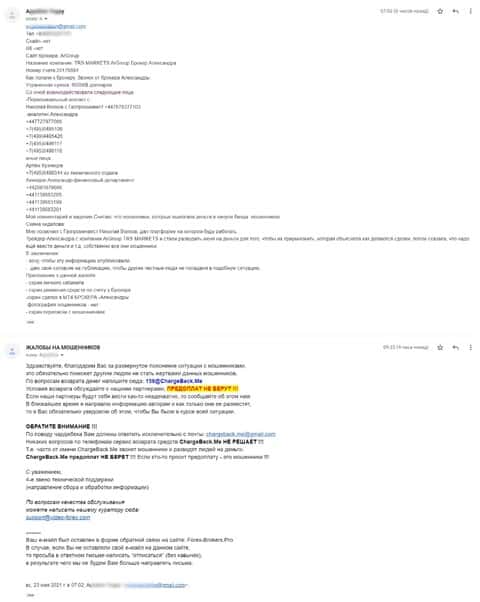 В разделе представлен скриншот письма с жалобой обманутого онлайн-пользователя, который сообщил название конторы, где его кинули, это был псевдоброкер ТРС Маркетс.