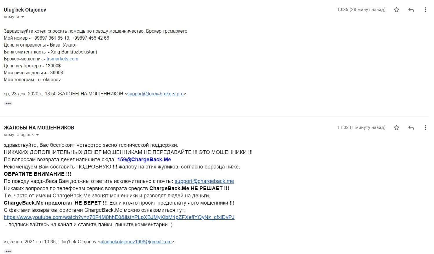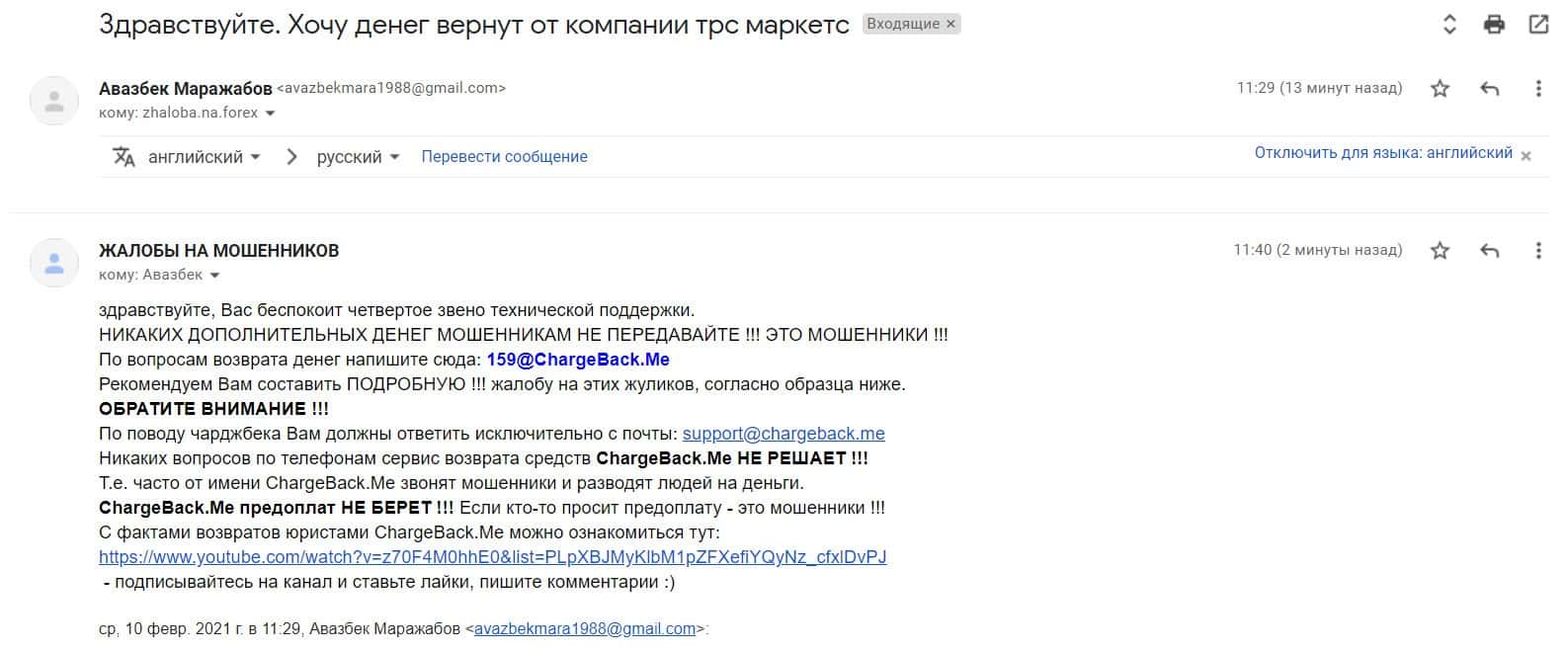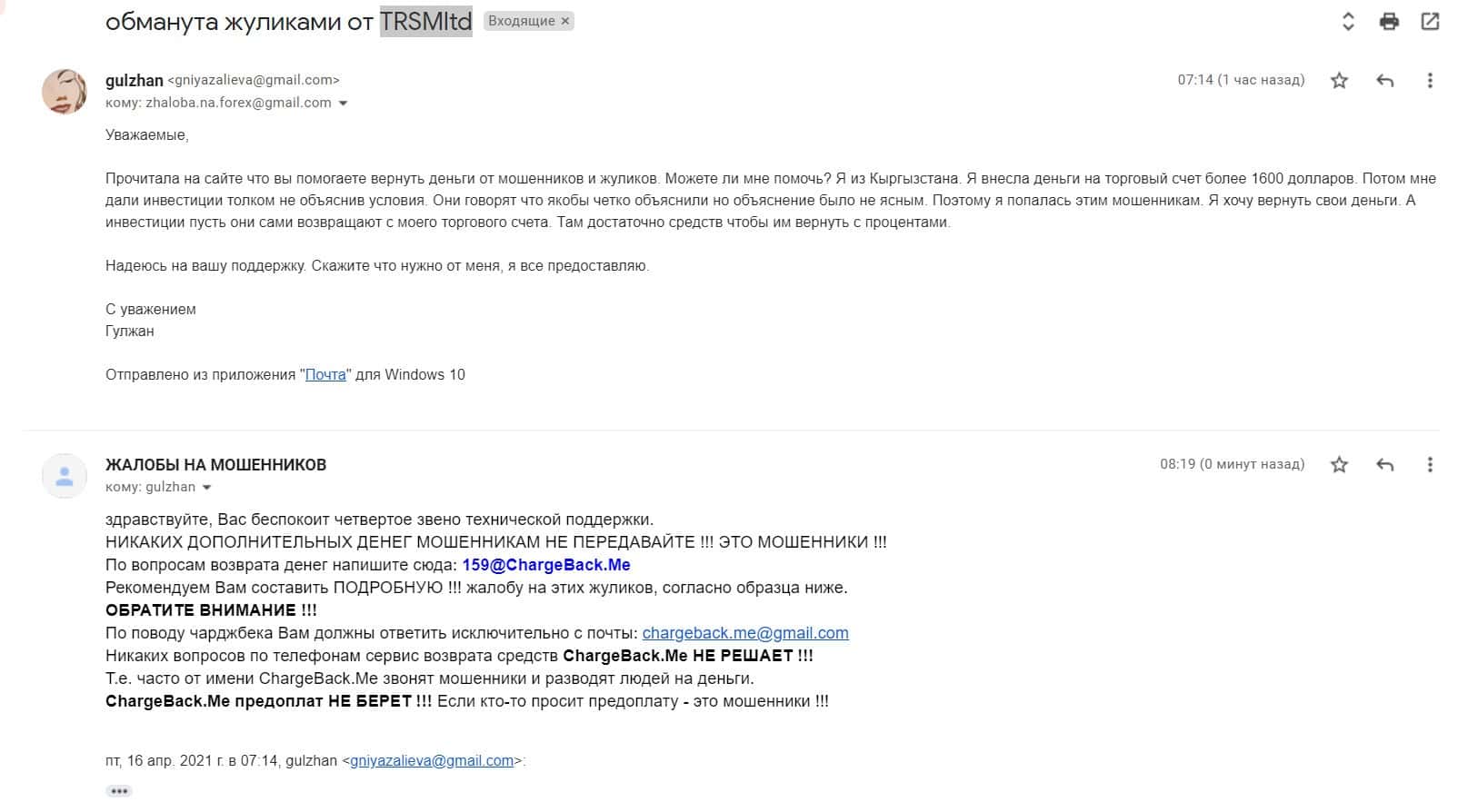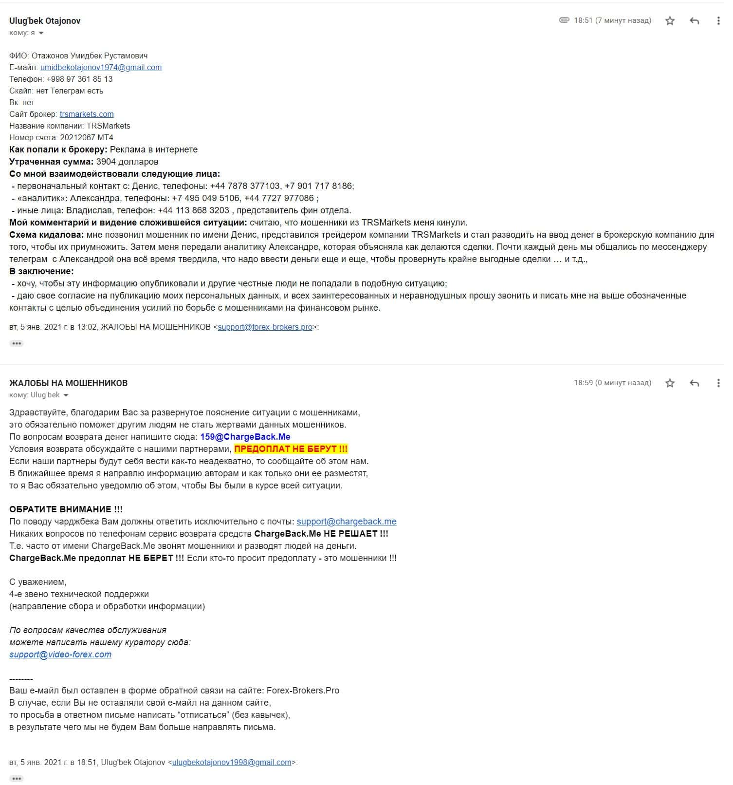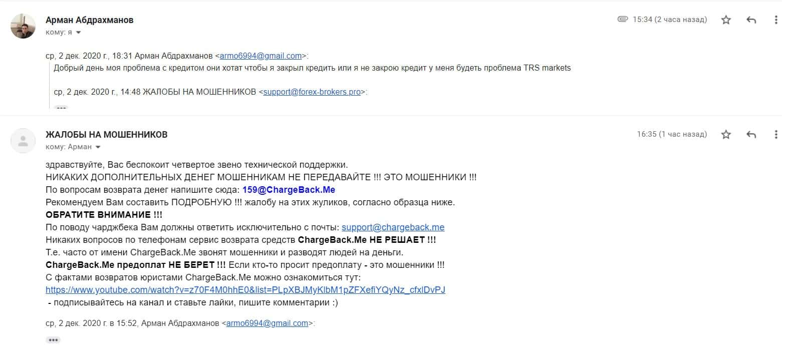 В разделе представлен скриншот письма с жалобой обманутого онлайн-пользователя, который сообщил название конторы, где его кинули, это был псевдоброкер ТРС Маркетс.