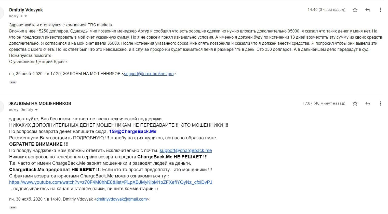 Автор данной жалобы написал, что сотрудничал с мошеннической организацией ТРС Маркетс, которая в итоге развела его на 350 долларов, и теперь он не может их вернуть.